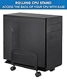 - Enhance your workspace with the Mount-It! Computer Tower Stand, designed to keep your desktop computer elevated and protected. This adjustable CPU stand fits most PC towers with widths ranging from 4.87 to 8.5 inches, ensuring broad compatibility. Crafted from heavy-duty steel, it provides a sturdy and reliable base capable of supporting up to 22 lbs. The built-in ventilation system improves airflow, reducing dust accumulation and helping to keep your computer cool and efficient.Equipped with four caster wheels, including two that lock, this mobile stand allows you to easily move your computer for maintenance or repositioning. The sleek black powder-coated finish adds a professional look that blends seamlessly with any office or home setup. Additionally, the compact design fits neatly under your desk, saving valuable space and keeping your work area tidy and organized. Choose the Mount-It! CPU Stand for a versatile, durable, and convenient solution to elevate your computer tower.