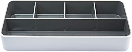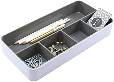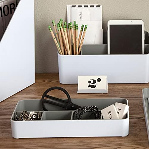 Clean, modern space-shaper that organizes small desk accessories. High-gloss, rolled edges provide bold contrast and sleek, modern design. Five separate compartments divide pens, pencils, paper clips and more. Plastic-infused durability. White exterior with gray interior.