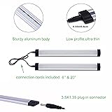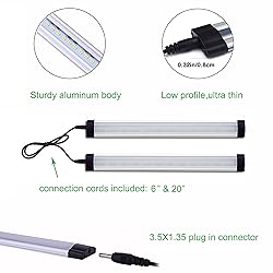 - This is a set of bright LED under cabinet kitchen light bar kit with dimmable switch, easy to install, energy saving and safe to touch.Widely used as counter top lighting,task lighting,accent lighting @ SPEC.: Color:Day white(6000K). Energy Saving: 3W, equal to 30W halogen, incandescent and fluorescent lamp. Lumen: 300 lumen per light panel CRI: >80 Size: Length: 11 inch, Width: 1 inch, Thickness: 0.32 inch Cable Length: Light bar Connector: 5.9 inch / 20 inch, Power Adapter: 80 inch, Power Adapter Connector: 12 inch Material: Aluminum alloy @ FEATURES: SAFE TO USE: UL listed power plug, 12Vdc output. EASY TO INSTALL: You can either use strong adhesive tapes or screws to install in wherever it fits. ENERGY SAVING: 3W LED is to replace 30W halogen under cabinet counter lights, >90% electricity bill saving. LOW PROFILE KITCHEN LIGHT: Only 0.32 inch of height, almost invisible after installing the slim counter lights. DIMMABLE: By using a dial dimmer switch, the under cabinet rigid bar lights can be used for dimming from 0% to 100%. Plus there is another On/Off switch inline, the dimming function can be remembered, you can have the same brightness next time when the lights turned on FLEXIBLE TO CONNECT: There are 2 different connection cables included, one is 5.9 inch, the other is 20 inch. Therefore the under cabinet lights can be connected according to different distance. @ PACKAGE INCLUDED: 6 x LED under cabinet rigid bar light 1 x power wall plug 1 x dial dimmer switch 1 x DC connector 5 x connection cable (5.9 inch) 4 x connection cable (20 inch) 12 x double sided adhesive stickers 12 x screw mounting buckle 12 x screw 8 x cable arrangement buckle @ REMOTE CONTROL: Should you need a RF remote control, please refer to the ASIN #B01M7TGZ9B, extension cables refer to ASIN B07J5XP2D3.