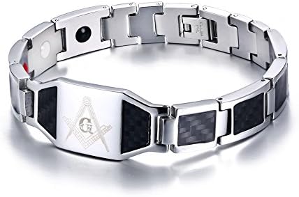 Handsome Masonic Bracelet for Men : Stainless Steel Carbon Fiber Inlay Men's Link Bracelet with Masonic Logo, Freemasonry Masonic Bracelet with Ajusting Tool, Masonic Jewelry Gift Idea,Silver