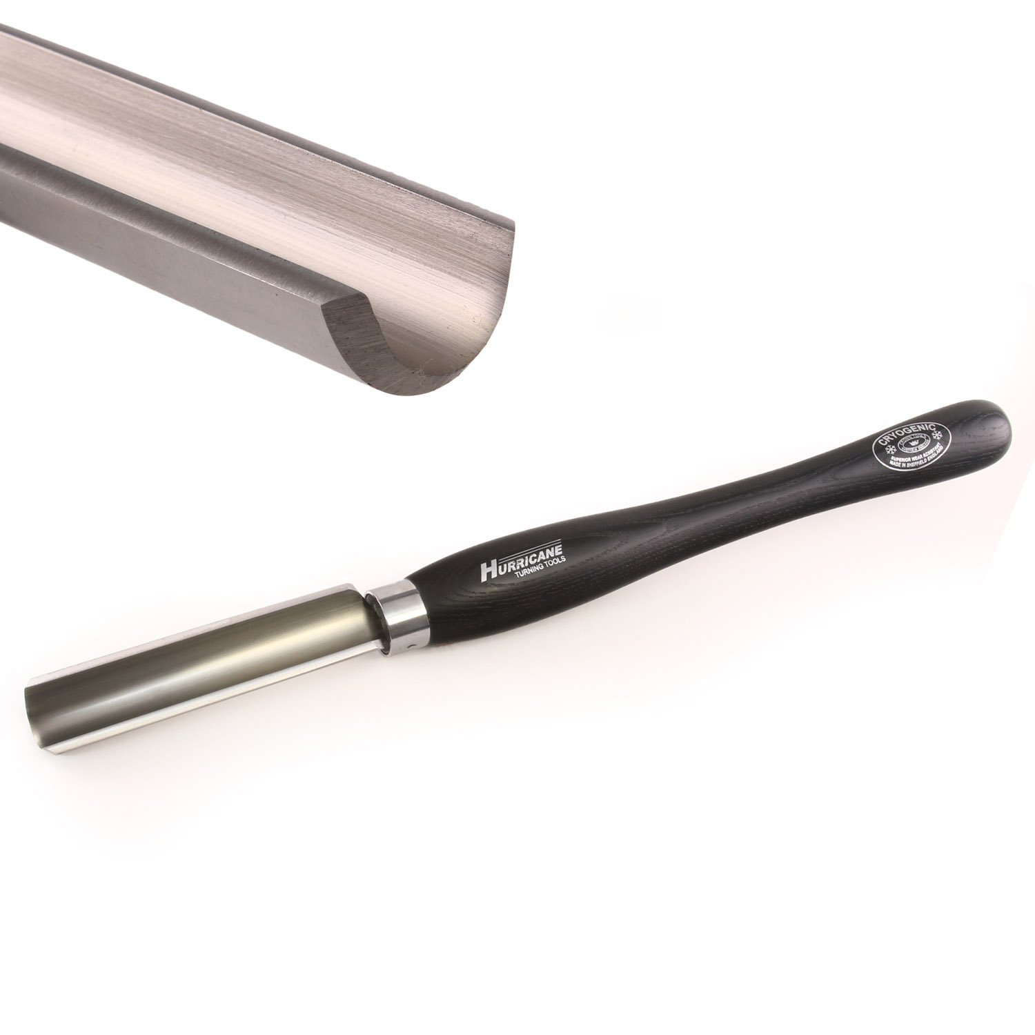 - Cryogenically treated M2 High Speed Steel with ash handle, painted black with silver accents; made in Sheffield, England in partnership with Crown Tools