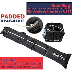 - Before you head up the mountain for another run, make sure you keep all your important ski gear close at hand with a versatile Athletico Ski Sleeve and Ski Boot Bag Combo. Skiing is one of the most fun and popular winter sports in the world. But as anyone on the slopes can tell you, there is some very essential gear you need to keep close before you move from the greens to the blacks. That’s why you need the Athletico Padded Ski Bag and Ski Boot Bag Combo designed to keep all your most important ski equipment dry and within arm’s reach. Tough, Water-resistant and Ready for the Snow Crafted with premium water-resistant polyester, our versatile ski sleeve features a 3/4 length wrap-around zipper to easily slide your skis or other gear such as helmet, ski poles, goggles, pants, and jacket. Other features include a padded handle for easy carrying. The ski bag fits most skis up to 200 cm, and the boot bag will accommodate most ski boots up to size 13. If you’re looking to stay safe on the mountain and keep your essential ski equipment dry and organized, then get the only bag made specifically for skis and ski gear—the Athletico Ski Boot Bag Combo. Product Details: 5mm foam padding throughout High-Density Polyester (Waterproof Backing) 3/4 Length Zipper For Easy Gear Loading Large Main Compartment Padded Carrying Handles Unique rolled end to secure shorter ski lengths Boot Bag Features Mesh Side Pocket To Store Additional Gea the mountain.