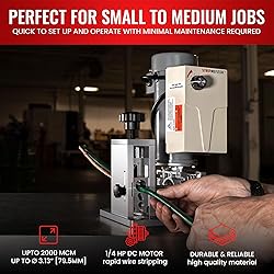 POWERFUL 1/4 HP DC MOTOR WITH VARIABLE SPEED CONTROL: Equipped with a fan-cooled, enhanced motor and precision speed control, the E250 wire stripper machine delivers unmatched power and safety for consistent, hands-free wire stripping. STRIPS A WIDE RANGE OF WIRE TYPES AND SIZES: This automatic wire stripper handles everything from Ø1/8" up to Ø3/4", perfect for commercial, industrial, and DIY applications. Certified for electrical and safety compliance with CSA, TUV, and CE standards. ULTRA GRIP FEEDER TECHNOLOGY FOR JAM-FREE PERFORMANCE: Advanced feeder design grips even twisted or mangled wires without slipping, ensuring smooth, uninterrupted stripping with zero downtime or snags. BUILT TO LAST WITH INDUSTRIAL-GRADE MATERIALS: Constructed from solid aircraft-grade aluminum and heat-treated tool steel, with all parts CNC precision-machined for maximum strength, durability, and lifespan. EASY TO ADJUST AND SAFE TO OPERATE: Includes a top-mounted blade depth reference knob for quick, precise adjustments, and plugs into any standard 110V outlet—CSA/UL safety approved for peace of mind.