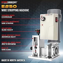 - Stripping electric wire scraps has never been easier than with the StripMeister E250 wire strippers. You can continuously strip wires and cables at variable speeds without hand cranking or using a drill. The stripping tool's ultra-grip technology effortlessly strips pinched, kinked, damaged, pig-tail spiraled, and candy caned wires on the first pass without slippage or jams. It's an electric wire stripper machine you can rely on. Quick switch built-in adjustable wire guide allows you always to have the right size wire guide at your fingertips. StripMeister E250 automatic wire stripping machine is made with aircraft-grade aluminum and heat-treated stainless steel hardware. This product will make you confident that your wire stripper will last a lifetime. It also has an impressive capacity to strip up to 10,000 feet of 250MCM fast, and you can avoid changing the blade.