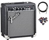 - For the beginning electric guitarist or anyone who wants a small, easy-to-use practice amp with quality tone, the Frontman 10G is at your service. Conveniently compact and built with classic Fender style, it delivers full sound from its 6" speaker, with a gain control and overdrive switch that rock guitar tones from tube-emulated overdrive to full-strength ultra-saturated distortion, perfect for blues, metal and famous Fender clean tone. For convenient personal listening at any time that won't bring the house down on anyone else within earshot, this amp features a headphone output jack. For thick overdriven distortion at the push of a button, the Frontman 10G features a convenient front-panel clean/overdrive switch. The Frontman 10G features the classic Fender look of sparkling silver grille cloth. Voltage: 120V Wattage: 10 Watts Controls: Gain, Over-Drive Select Switch, Volume, Treble, Bass Channels: One Inputs: One - 1/4" Cabinet Material: 7-Ply 3/4" Medium-Density Fibreboard Amplifier Covering: Black Textured Vinyl Grille Cloth: Silver Amplifier Jewel: Red LED Front Panel: Blackface Style Handle: Molded Plastic Strap with Nickel-Plated Caps Speakers: One - 6" Fender Special Design Total Impedance: 4 ohms Amp Height: 11" (27.9 cm) Amp Width: 10 Austin Bazaar bundles your instrument with necessary accessories. Everything you need to start playing immediately comes in one box. This bundle contains an instrument cable for reliable connectivity and Austin Bazaar Exclusive 12-Pack picks are included so you can start playing right out of the box. WARNING: Cancer and Reproductive Harm - www.P65Warnings.ca.gov.
