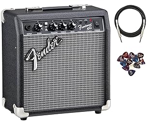 PERFECT PRACTICE POWER: The Fender Frontman 10G Combo Amp features 10-watt output that delivers the ideal amount of power for home practice without overwhelming volume VERSATILE TONES: The overdrive switch allows you to easily switch between clean and distorted tones, adding flexibility to your sound EASY CONNECTIVITY: The 1/8" auxiliary input and headphone output jacks let you connect media devices for play-along sessions or practice silently with headphones RICHER SOUND: The closed-back construction enhances bass response, providing a fuller and more resonant tone EVERYTHING IN ONE BOX: Austin Bazaar bundles your instrument with necessary accessories; Everything you need to start playing immediately comes in one box; This bundle contains an instrument cable for reliable connectivity and Austin Bazaar Exclusive 12-Pack picks are included so you can start playing right out of the box