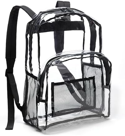 - Mochila transparente para transportar libros escolares y artículos de uso diario; hecha de plástico PVC resistente al agua.