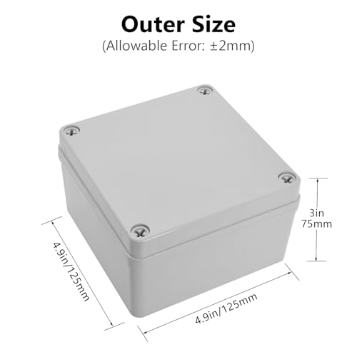 Outer Size of Project Enclosure: 4.9" x 4.9" x 3"/125 x 125 x 75mm(L*W*H); Inner Size Project Enclosure(Approx.): 4.7"x4.7"x2.1"/119x119x54mm (L*W*H)- - (Allowable Error: 1mm- -*** Tips: in order to confirm the detailed installation dimensions, please refer to our detail image, which shows specific internal dimensions of the product.); Screw Thread Dia.: 0.63"/16mm