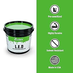 Simple and Easy - Our L.E.D emulsion is one of the best screen printing supplies you can buy. Premixed and Pre-sensitized for ease of use and ready to apply to your screen printing screens right out of the canister. Use with your Favorite Products - Fully compatible with all plastisol ink screen printing techniques as well as UV ink. Make sure you pick up some emulsion remover for when you are done to reclaim your screens. Designed for Long Use - When used with your preferred silk screen printing kit this emulsion is ultra durable and can be cured with a emulsion exposure unit, or High quality UV light . Neither use is not an issue with this emulsion. Use an emulsion scoop coater for clean even coverage. Perfect for All Skill Levels - Whether this is your first screen print kit or you are an advanced printer, Ecotex has your back. 12 month shelf life and proudly made in the USA Extended Shelf Life - Pre sensitized photo emulsion does not require the addition of diazo and therefore has a very long shelf life of over a year! Perfect and economical silk screen emulsion for your print shop.