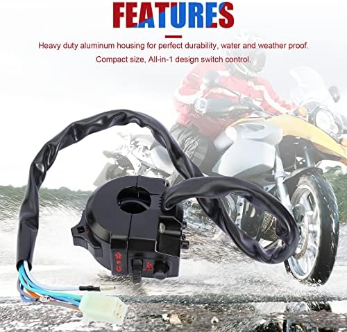Specifications: Position: left. Voltage: DC 12V. Color: black anodized. Cable length: 18 1/2inch (47cm). Diameter of hole: 7/8inch (22mm). Switch thickness: 1 1/4inch (3.2cm). Material: PVC, ABS, heavy duty aluminum shell. Package included: 1 x motorcycle left side control switch. Compatible with: Fits universal switch for 7/8inch diameter handlebars. Fits most motorcycle, motorbike, ATV, quad, scooter, go kart, moped, chopper, pit bike, dirt bike, racing bike, mini bike and other bike. For Suzuki, Yamaha, Kawasaki, Ducati, Aprilia, Vespa, Kymco, Piaggio, Agusta, Banshee, Polaris with 7/8 inch handlebars. Features: Heavy duty aluminum housing for perfect durability, water and weather proof. Compact size, All-in-1 design switch control. Built in turn signal switch, horns switch and hi/lo beam switch. Easy access & comfortable control, will not interfere with clutch. Perfect for dual sport applications or any street motorcycle.