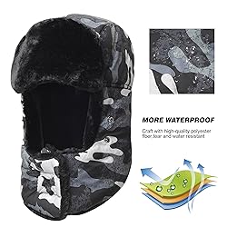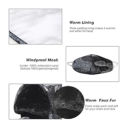 WIND PROOF: 100 percent Polyester Insulating Polyester Outer Shell Combined With a Luxurious Inner Faux Fur Layer Very Effective to Keep Your Head More Warmer. Unique Design With a Removable Mask: So Easy to Use and Keep Your Face Mask:cotton/nylon and Ears Warm in Winter, as well as Against the Strong Wind and Cold Weather. Very Warm and Comfortable Winter Hat. Lengthen the Chin Strap Like a Bib Prevent Your Neck From the Invasion of the Cold Wind, Super Warm, Soft and Comfortable.The ear flaps also can be worn down for extra warmth and style or neatly folded up and tied at the back of the neck. SUPER WARM AND CONVENIENT: A wonderful hat for wearing while skiing, snowboarding, skating, sledding, snowshoeing, camping, hiking or any outdoor sports and activities. Pair off with your favorite winter Outfit.or Suit for Party Gift UNISEX FITMENT: One size Its most, ideal for 22 inches to 24 inches head circumference.