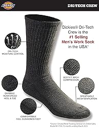 - Dickies dri-tech comfort 6 Pairs crew with wicking, moisture management fibers keeps feet dry, ventilation channels engineered for air circulation and moisture control, arch compression hugs feet and keeps socks in place, while providing in-step support, Reciprocated heel and toe for superior fit and full cushion comfort