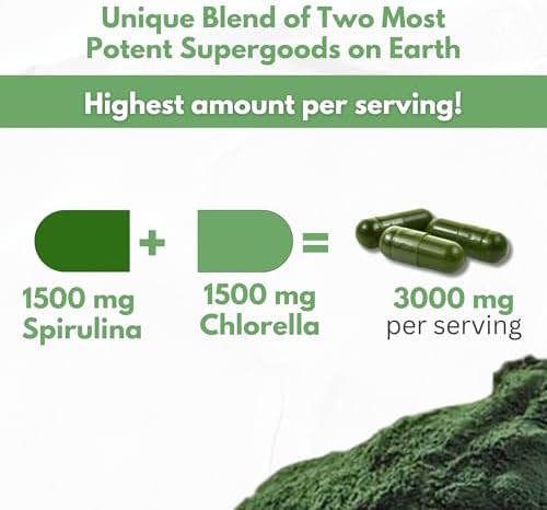- We combine TWO MOST NUTRIENT DENSE VEGAN SUPERFOODS! - Our 3000 mg per serving combination of spirulina chlorella will produce some of the best detox and nutrition results. Both are full of proteins, vitamins, minerals, antioxidants, and chlorophyll. They boost and energize you from within, enhance digestion, reduce fatigue & provide many other benefits.