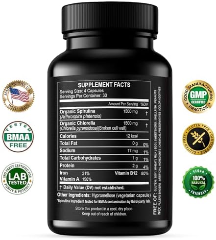 Chlorella Spirulina Powder Capsules 3000 mg of BMAA Free Purest Blue Green Algae - Best Natural Detox Raw Vegan Vitamins Protein Green Superfood - Made in USA