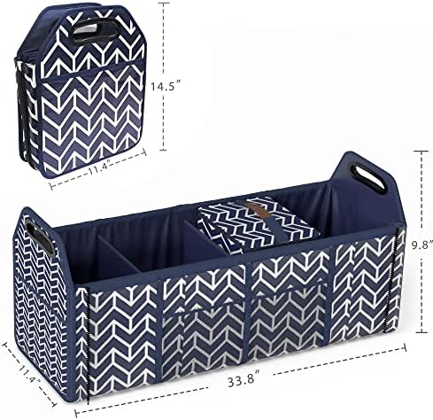 - Practical Design for Storage - You can easily organize your car trunk stuff with its practical design for storage. It is 33.8 X 11.4 X 9.8 Inches with 4 compartments. Each compartment has ample storage space, each of them can be folded to make the bag smaller. There are two pockets in the both side of bag, two mesh pockets in the front and back. Pockets prevent tiny items from sliding and mesh pockets allow you to see what you have put in it. Navy blue and white pattern looks unique and stylish.