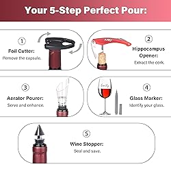 - Product Introduction: 5 pcs of wine set include: wine corkscrew opener, wine stopper, foil cutter, aerator pourer, glass paint marker Each piece of this set is fully able to handle anything you throw at it with ease. Design: Hold all your wine opener tools in a red wine shaped box, this lovely set can be stored nearly anywhere as its compact design. Size: 13(L) x 3(W) inches Perfect gift for Valentine's Day, Thanksgiving Day, Mother's Day, Father's Day, housewarming, birthday, holiday, wedding or anniversary. The glass stickers include some adult themd stickers, they are packed in a black envelope with words "Adult Only" signed on it. So if you don't like it, just take them out from normal glass stickers. Weight: about 13oz