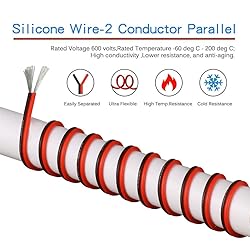 BNTECHGO 22 AWG red black 2 conductor parallel silicone wire,ultra flexible soft,easily separated, easy to use. Long life: 22 Gauge 2 conductor parallel silicone wire Core made with 60 strands 0.08 mm tinned copper wire per conductor,tinned copper wire has a better anti-oxidation performance,feature high conductivity,lower resistance,reduce the producing of heat,and anti-aging. Silicone rubber insulation which make it more durable and eco-friendly.High temperature resistance 200 degree C,low temperature resistance,in extreme cold -60 degree C.Rated Voltage: 600 volts. Widely used: for single color LED strip lights,various DC electrical hookups including model planes,model cars,model ships,lamps,household appliances,electric heating appliances,meters,instruments,motor and digital fields. Package Included: 50 feet 22 gauge red black 2 conductor parallel silicone wire.Also available 8 gauge,10 gauge,12 gauge,14 gauge,16 gauge,18 gauge,20 gauge,22 gauge ultra Flexible 2 conductor parallel silicone wire.