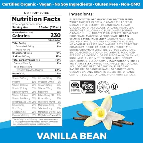 • CLEANER INGREDIENTS: Orgain Vegan Nutritional Shakes serve up complete nutrition including 16g of organic plant-based protein, over 21 vitamins and minerals, 10 Organic fruits and vegetables powder (including Acai, Spinach, Kale) & 230 Calories per Serving