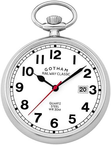 Gotham men's railroad style stainless steel pocket watch. Features includes scratch resistant domed mineral crystal, white ceramic dial, Japanese quartz date movement and water resistant to 30 meters. Watch arrives with deluxe 14" chain, operating instructions, lifetime warranty and gift box.