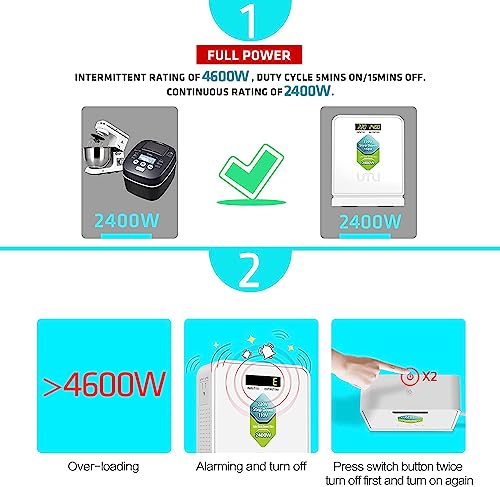 - 【FULL POWER】Intermittent rating of 4600W - duty cycle 5mins on/15mins off. Continuous Rating 2400W. Unlike other compact converters or bulky voltage converter that stated 2000W can only work with 1600W appliance. Or stated 3000W, but can only work with 2400W. We say 2400W, then the power rating is 2400 watts, you can run your 2400W device continuously.