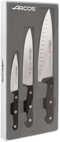 • Juego de cuchillos ARCOS de 3 piezas de acero inoxidable. 2 cuchillos de chef y 1 cuchillo para pelar. Cuchillos de cocina profesionales para cocinar. Mango ergonómico de polioximetileno POM. Serie Universal. Mayor control. Color negro.
