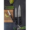 • «Dimensiones: hoja del cuchillo de pelar: 205 mm de longitud, hoja: 100 mm | 4 pulgadas. Cuchillo Chef 1: hoja: 150 mm | 6 pulgadas Cuchillo Chef 2:323 mm de longitud. Hoja: 200 mm | 8 pulgadas.
