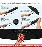 Upgraded Automatic Umbrella- Easy one hand operation with one auto open & close button, simply touch it to expand or collapse; Windproof - 8 reinforced fiberglass ribs flex slightly in powerful gusts keeping the umbrella from turning inside out and leaving you soaked; Compact & Ultra lightweight- At 11.8” when compacted, easily fits in your work bag, purse, backpack, car container etc. Weighs 14 ounce with a handy wrist string for convenient carrying around; Waterproof- Put the technology of Teflon to work for you! Waterproof and instantly dry, our Travel Umbrella defends against the elements like nothing else; Ideal Gift & Quality Guarantee: This compact travel umbrella is portable for your travel; it's also a creative gift for your parents, friends, colleagues and etc. Using this folding umbrella, you are always protected from rain, wind and UV. If anything goes wrong with your umbrella, we will send you a replacement absolutely free, no return required.