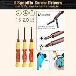 【Suitable for Left or Right Joycon】-- 33 PCS Joystick replacement kit can be used to disassemble and assemble game consoles.The original plastic slider lock is used to lock the connection of Joy-Con and Switch host,it will invalid after prolonged wear.The Replacement joysticks set,which is designed for the Nintendo Switch left / right Joy-Con,can repair wore, out of control, insensitive and drift analog joystick. Great backup for all Nintendo Switch Fans 【Complete Repair Kit】-- 33PCS Joycon Joystick Replacement package includes - 4 x Joycon joystick replacement, 2 x Alloy Slider Lock Buckles, 8 x screws Y,4 x screws +,2 x green pry piece,1 x Cleaning Cloth,1 x tweezer,1 x Triangle paddle,1 x suction cup,1 x cleaning brush,4 x Thumb Stick Cap,1 x pry tool,1 x Magnetic 2.0 screwdriver Y,1 x Magnetic 1.5 screwdriver Y,1 x Magnetic 2.0 screwdriver + 【High-quality Screwdriver】-- The dual Material handle offers a more comfortable grip and higher performance. The drill bit of the joycon joystick replacement is made of high-quality stainless steel with high strength and toughness, so you can easily repair the game console without damaging the game console. screwdriver with magnetic tips will make it so easy to simply lift the screw after it's finished unraveling 【Great Material】-- Made of plastic and metal, the full sense of control and robust quality than others.Use for replace the original old and damaged parts, makes it looks new all the time. Easy to install and detach. To bring you better gaming experience 【Easy Installation】-- Suitable for someone who has a skilled hands-on ability, we are not responsible for any damage to the Nintendo Switch during repair work, please be careful and slowly when you replace it in case to destroy the buckles or controller.All our joycon joystick replacement will be inspected before packaging to ensure that the goods you receive are in good condition