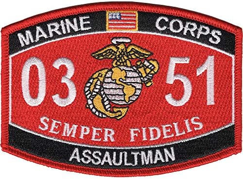 United States Marine Corps Military Occupational Specialty 0351 Assaultman MOS* Iron On Backing* Officially Licensed Product of the United States Marine Corps.* Popular Patch is your source for high quality embroidered military patches.* Collectible military patch reproduction, brand new, never used or worn.* Height: 3.25 inches, Width: 4.50 inches* Shape: Custom* Edging: Merrowed Edge