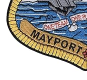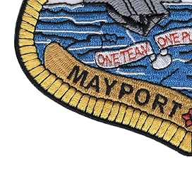 - MAYPORT US Naval Station Florida Military Patch ONE TEAM ONE PURPOSE ONE NAVY - A Version - It contains a protected harbor that can contain aircraft carrier-size vessels, ship's intermediate maintenance activity , and a military airfield with one runway. - White background with blue embroidery similar to water with two ships and one helicopter in the scene. * Iron On Backing * Height: 4.50 inches, Width: 5.00 inches * Shape: Shield * Edging: Flat Edge