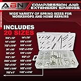 EFFORTLESSLY FIX THE PROBLEM: The ABN Compression & Extension Spring 200 pc Assortment Set, Heavy-Duty Steel Wire – Metal Tension Springs Replacement Kit is a selection of 200 tension-giving spring devices in 20 different sizes and styles so you do not have to waste time and money searching at the hardware store for that one spring; This assortment includes a wide range of small compression and extension springs for workshops and home repairs VARIOUS APPLICATIONS: Replace old, rusted, busted, or missing springs with these strong steel springs in any shop or household application; Fix a pull-down screen in your motorhome, repair your swinging camper door, gate latch, printer, or even use as a cage spring lock – the possibilities are endless PERFECT TENSION: Constructed from #75 zinc-plated steel for rust resistance, maximum strength, and ultimate longevity; Spring coils are both durable and flexible for the right amount of tension EASY STORAGE: Transparent 8.1” x 4.1” x 1.1” inch (20.6cm x 10.4cm x 2.8cm) clear plastic carrying tray for easy transportation, safe storage, and quick organization; Sizing chart included for simple identification 20 SIZES: Compression springs – (10) 9/32” x 1/2", (10) 1/4" x 13/32”, (10) 7/32” x 11/16”, (6) 3/8” x 5/8”, (12) 3/8” x 3/4”, (10) 9/32” x 3/4", (8) 23/64” x 1-3/8”, and (10) 7/32” x 1-1/2”; Extension springs – (10) 13/64” x 13/16”, (10) 7/32” x 1”, (10) 1/4" x 7/8”, (8) 5/16” x 1-1/8”, (10) 5/16” x 1-1/4”, (12) 11/32” x 1-27/32”, (12) 5/16” x 1-3/4”, (12) 9/32” x 2”, (12) 5/32” x 3-1/8”, (8) 3/16” x 1-3/4”, (10) 9/32” x 1-1/2”, and (10) 11/32” x 1-7/16”