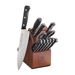 ULTRA-SHARP BLADES: Superior professional-level sharpness that ensures precision cutting. THE LAST KNIFE YOU’LL EVER NEED TO BUY: German Engineered Knife Informed by over 100 Years of Mastery. HENCKELS knives are built to last. EFFORTLESS CUTTING: Enjoy easy cutting with minimal effort with this lightweight, easy-to-use knife. SET INCLUDES: 4-inch paring knife, 5-inch serrated utility knife, 8-inch chef's knife, Six 4.5-inch steak knives, kitchen shears, 9-inch sharpening steel, and 11 slot hardwood knife block QUICK CLEAN UP: No-fuss cleanup, in the dishwasher or by hand. Stain and rust-free blades. WORTH THE SPLURGE: HENCKELS knives start out razor-sharp and stay sharper longer, even with minimal care. DURABLE BLADE: Single-piece, precision-stamped blade construction provides durability. STAYS SHARP LONGER: Professional, satin-finished blade boasts precision cutting and is finely honed for long-lasting sharpness