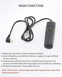 - This camera shutter release cable is a compact remote switch with a 90cm cable which replicates all functions of the camera shutter release button, it is used to minimize vibration for different shooting situations such as close-up and long time exposures. RS-C2 replaces for Canon RS-60E3, Pentax CS-205, Samsung SR9NX01, Contax LA-50 shutter release cable. Compatible Camera Models: For Canon EOS cameras: EOS Rebel T8i, T7, T6, T5, T3, XS, T7i, T6s, T6i, T5i, T4i, T3, T3i, T2i, T1i, XS, XSi, XTi, XT, SL1, SL2, SL3 EOS 90D, 80D, 77D, 70D, 60D, 60Da, R, RP, R6, R6 Mark II, R7, R8, R10, R100, M6, M6 Mark II, M5, etc. For Canon Powershot cameras: Powershot G16, G15, G12, G11, G10, G1X, G1X Mark II, G1X Mark III, G3X, G5X, SX50 HS, SX60 HS, SX70 HS, etc. For Pentax cameras: K1, K3, K3 II, K5, K5 II, K5 IIs, K7, K30, K50 K10D, K20D, K100D, K100D Super, K110D, K200D, K500 645D, 645Z, ist, ist D, ist DL, ist DL2, ist Ds, ist DS2, MZ-6, MZ-L, ZX-L For Samsung cameras: GX-1L, GX-1S, GX-10, GX-20, NX10, NX100, NX5 Package includes: 1x Shutter Release Cable 1x Instruction Manual