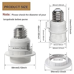 Appropriate Size:Please note the size:Height:2.91"(74mm),Diameter:1.49" (38mm).Widest Diameter:1.73"(44mm),Please check if the size of the product is suitable for your lampshade. Introduction:E26 socket extension with lampshade rings,extending standard E26 socket by 4.8cm/1.89 inch,great extender to lower your bulbs further in recessed fixture, allow light to disperse in 360 degrees, making your room brighter. Easy to Use:You can easily to screw into an existing E26 screw socket,No need to replace your existing lighting fixture that bulb cannot be screwed in. Essential for adding covers for bare bulbs:The thread socket extender with shade ring is not just a good way to solution for recessed or deep hole light fixture, also can help you install a lampshade on originally light fixture that not have a lampshade.The maximum diameter of our lamp holder is 4.4cm/1.73inch, and the diameter of the outer ring of the lamp holder is 5.7cm/2.24inch.NOTE:Please make sure to measure the inner diameter of your lampshade to confirm that there is enough space to accommodate this extender before purchasing,not all lampshades are suitable. Basic Parameter:Voltage range: 0-250V / 60 Hz, Wattage range: 0-60W, Best for LED/CFL bulbs with wide base.