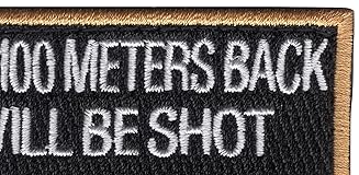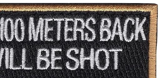 - United States ARMED FORCES Caution Stay 100 Meters Back or you will be Shot Military Patch COLOR VERSION * Height: 2.37 inches, Width: 4.00 inches * Shape: Rectangle * Edging: Flat Edge * Hook and Loop