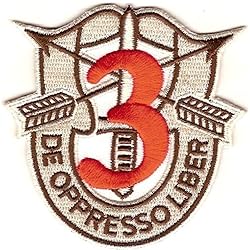 - 3rd Special Forces Group Crest desert version with red numeral "3" patch - "DE OPPRESSO LIBER" * Height: 3.00 inches, Width: 3.00 inches * Shape: Custom * Edging: Flat Edge * Sew On (plastic backing)