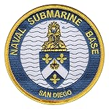 - NAVAL SUBMARINE BASE San Diego CA Military Patch - White and navy blue background with shield crest in the center. * Height: 4.00 inches, Width: 4.00 inches * Shape: Round * Edging: Merrowed Edge * Iron On