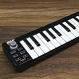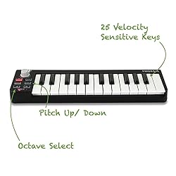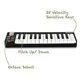 SIMPLE MIDI MAPPING: Assign the synth surface rotary knob or set the keys to CC mode and MIDI map control change messages to any parameter or function to record in your favorite DAW. Compatible with all digital audio workstation software like Logic, Ableton Live, Pro tools or GarageBand for professional electronic music production UNIVERSAL COMPATIBILITY: A single cable connects the mini travel size piano to the USB port of any Mac or PC laptop computer or desktop PC. No extra power adapter necessary! Great desk equipment accessories for any recording studio musical station 25 VELOCITY SENSITIVE KEYS: MIDI 25 velocity sensitive keys are pressure sensitive to bring large or small sound dynamics to your performance. Change nano controller hardware station between 3 velocity curve settings or set to constant velocity LED LIGHT OCTAVE AND KEY SELECTION BUTTONS: Quickly change the synthesizer key or the octave range of the key board without adjusting your software. Choose octave up or octave down and enjoy a full range on this black compact portable keyboard with 2 assignable buttons INCLUDES MIDI EDITOR SOFTWARE: Download and install the programmable software kit to your Windows or Mac and make advanced edits to the global MIDI channel - switch between toggle and switch mode, or change CC value for both on and off