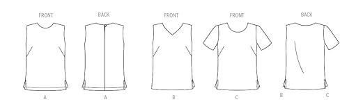This New Look sewing pattern kit comes with sewing templates, fabric recommendations, pattern pieces, and instructions, and the packaging includes information on how to select fabric and trims, as well as sizing information Patterns included in this clothing sewing pattern packet can be made to fit misses sizes 10-12-14-16-18-20-22 Pattern includes choice of sleeveless or short sleeves and scoop or V-neck; all views include bust darts with side slits Fabric suggestions: charmeuse, challis, cotton types, crepe, linen types, silky types; allow extra fabric for matching plaids or stripes New Look patterns are proudly designed and manufactured in the United States.