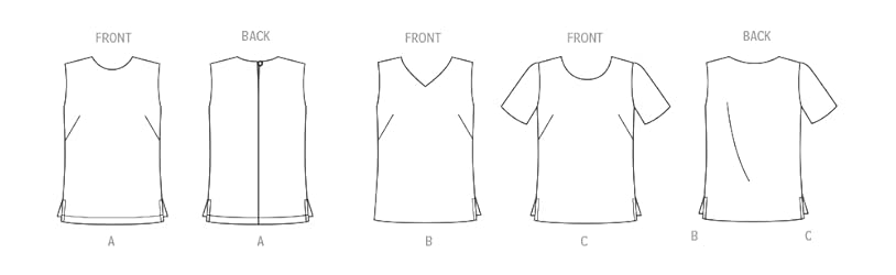 - Create the ultimate essential wear anywhere top that is Easy to Make! Pattern includes choice of sleeveless or short sleeves and scoop or V-neck. All views include bust darts with side slits. Click "Envelope Back" directly above for more information. Fabric suggestions: charmeuse, challis, cotton types, crepe, linen types, silky types; allow extra fabric for matching plaids or stripes. This New Look sewing pattern kit comes with sewing templates, fabric recommendations, pattern pieces, and instructions, and the packaging includes information on how to select fabric and trims, as well as sizing information. Patterns included in this clothing sewing pattern packet can be made to fit misses sizes 10-12-14-16-18-20-22. Proudly designed and printed in the United States.