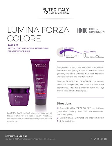 SHAMPOO POST COLOR - 300ml, Hair coloring and bleaching require special care and hydration to maintain an intense color and shine as long as possible. Hair is vulnerable to very aggressive shampoo, the sun and wind factors that cause color loss. SHAMPOO POST COLOR is formulated especially for colored (chemically treated) hair. Its low pH helps to close the cuticle after chemical processes, prolonging tonality and vibrancy. It protects against environmental elements and contains neutral pigment to help maintain high pigment density in hair, ensuring shine and vitality. It maintains bright color from root to shaft end. Shampoo that helps prolong colored hair. Protective shampoo for colored hair. Helps prevent premature color fading by sealing the cuticle thanks to its slightly acid pH. Developed with TRICONE and TRICOERBA, protein and botanical compounds that help improve hair’s appearance. Protects the hair from UV rays thanks to its TRICEL-R complex. Ideal for washing your hair after coloring it. Directions: 1 | Apply a small amount, massaging gently. 2 | Rinse. 3 | We recommend using DUE FACCETTA LUNGA DURATA. 4 | Daily use. LUMINA FORZA COLORE Red - 280g, Revitalizing and color intensifying treatment for hair. Designed to prolong color intensity in colored hair. Revitalizes hair, giving it back its softness, manageability and shine. Enriched with Tahiti Monoi oil, which conditions and moisturizes hair. Contains TRICONE and TRICOERBA, protein and botanical compounds that help improve hair’s appearance. Provides protection form UV rays thanks to its TRICEL-R complex. Directions: 1 | Spread LUMINA FORZA COLORE evenly throughout clean, slightly humid hair. 2 | We recommend the use of gloves. 3 | Leave in for 20-30 minutes and rinse completely. 4 | Style as desired.
