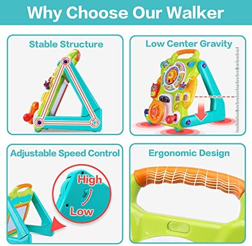 - Previene las Piernas de Arco - El mango de fácil agarre, la regulación de velocidad y una estructura triangular hacen que los pasos de tu bebé sean seguros. Permite que los compañeros enseñen al bebé la forma correcta de caminar, sin piernas de arco.