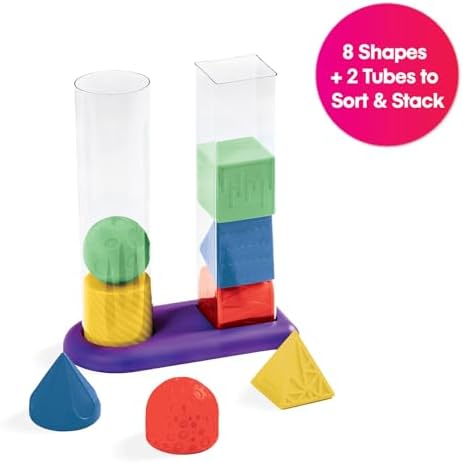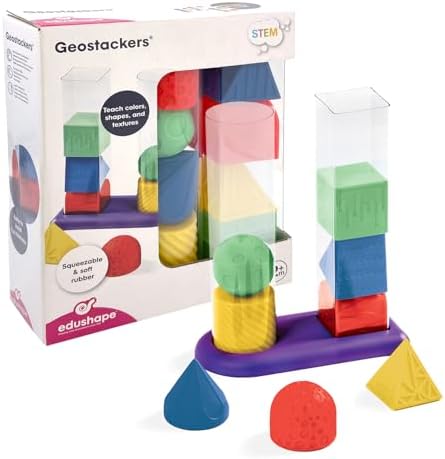 - Stack and sort eight geometric shapes, helping develop various sensor skills such as logic and reasoning and hand eye coordination