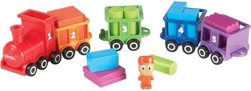 - BUILD: Five-caster train set builds color, shape, and number recognition with blocks that double as building toys