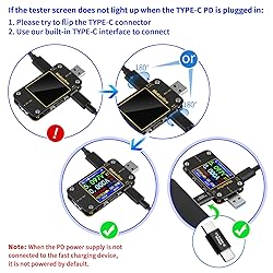 [New upgrade] : The product supports two-way insertion detection, increases the current direction indication direction, 1.54 inch large LCD screen, super clear resolution 240×240, 4 operation buttons, 5 interfaces, the page before and after the upgrade is more convenient to switch. Plugs with gold-plated USB contacts have a strong coating that protects against scratches, stains and damage [Wide application range] : Can measure various USB chargers /PC/ laptop/desktop computer/mobile phone/charger/charger/discharge load/car charger/cable. Support Type-C interface full digital compatible PD protocol/Qualcomm QC3.0/4.0 protocol one table compatible with multiple protocols, fast charge support PD QC2.0 QC3.0/4.0 MTK and other protocols, support USB2.0 500M, USB-A support USB3.0, can reach 5G [New reminder function] : temperature alarm: more than 45℃, the temperature display flashes; Voltage alarm: less than 3.8V or more than 30V, the voltage display flashes; Current alarm: greater than 3A, the current display will blink [Flexible color display interface] : Support screen 360 degree rotation, to meet any Angle reading. Press the corresponding button of the horizontal menu bar to rotate the screen. When the various digital devices are inserted at any Angle, a positive reading can also be obtained, making the measurement more convenient [Strong after-sales service team] : As long as you have any questions about the product, we will be the first time after receiving your email for you to solve. Your satisfactory purchase experience is our greatest hope! How to send us email? Please click on "MakerHawk-US" and click on "Ask" to email us! Looking forward to your consultation [Note] : When PD power is not connected to the fast charge device, the power is not supplied by default. After the TYPE-C PD is inserted, the test screen is not on. 1. Flip the TYPE-C connector 2. Our built-in TYPE-C interface is used for connection and TypeC interface charger is used. According to the protocol, no load is connected and no power is supplied by default