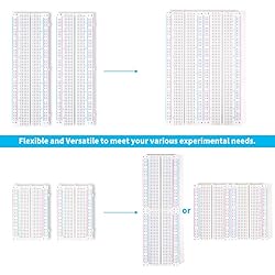 400 point and 830 point breadboards are available to meet your various experimental needs. White ABS Plastic Body with Black Printed Legend. Color Legend on Distribution Strips. With Self-Adhesive Tape on the Back, Easy to Stick on the Arduino Prototype Shield. Inter Connect Any Components with 20-29 Awg (0.3-0.8mm) Wire. Good for Arduino Breadboard Jumper Wires kit Project and other Electrical DIY kits.
