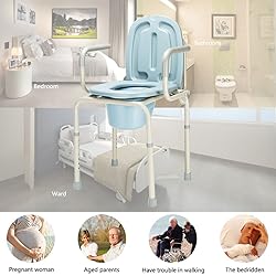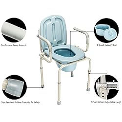 - Features:1. Easy bedside access. This sturdy portable commode will make it easier for anyone needing a toilet close to the bed or wherever you choose. It also works as a toilet riser or safety frame on your existing toilet2. Sturdy and stable base. The seating maximizes stability and supports up to 450lbs. Contoured plastic armrests add to comfort and safety3. Slip-resistant. Slip-resistant rubber tips add to safety4. 8 quart capacity pail. 8 quart capacity pail comes with lid that rests on top5. Durable steel frame is easy to clean and maintain has fixed back and drop-arms for easy patient transfer. Not for shower use. Commode can be used as a bedside commode, toilet safety frame, elevated toilet seat or over your exist6. Easily get up and down from the toilet. Maintain independent living7. A commode toilet chair that adjusts to your individual height and needs Specifications:1. Material: Steel & Plastic 2. Color: Gray3. Dimensions: 19.29" x 22.63" x 28.54"-34.44" / 49 x 57.5 x 72.5-87.5 cm4. Seat Height (Seat to Floor Height): 17.5"-23.62" / 44.5-60cm5. Adjustable Gear: 76. Weight: 16.1 LBS / 7.3KG Package Includes:1 x Commode 1 x Manual
