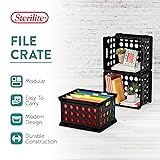 - Instantly organize nearly any space in your home, office, or classroom with this 12-Pack of Sterilite Stackable Sturdy Storage Crate Organizer Bins with Handles. Keeping your home or office clutter-free is a snap with this set of 12 crates. These versatile and durable file crates are an economical storage solution for all general storage needs, not just your office paper. With recessed rails, these plastic file crates provide a convenient place to hang your letter-size files. Made from heavy-duty plastic, these totes will continue to provide a great storage solution for many years. Keep your belongings organized without putting them out of reach. These file crates are a versatile solution that can address many different storage needs in the home or office. Capable of holding letter- and legal-size hanging folders you can bring order and organization to important papers and documentation. Multiple crates stack on top of each other to use vertical space efficiently, and integrated handles allow for easy transporting. The overall dimensions of each crate are 17.25 inches long by 14.25 inches wide by 10.62 inches high. De-clutter your space and create your ideal storage system with the 12-Pack of Stackable Sturdy Storage Crate Organizer Bins from Sterilite.