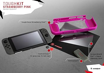 - Do you take your Nintendo switch everywhere you go? Then the Tough: Kit is something you definitely need. Nintendo switch game screen protector includes a Rubber Hard Case Cover made with a rugged and stylish design that can withstand even the toughest abuse and a Game Case that can store and protect up to 4 games cartridges anywhere you go. Also included, with this switch hard case cover for Nintendo switch is a set of controller caps that enhances your grip and protects your joysticks from the normal wear and tear and a scratch resistant Screen Shield Protector made of tempered glass. Content: - Tough: Case Pink - Game: Case - Screen: Shield Pro + black cleaning cloth - Control: Caps (1x grey cap, 1x red cap)