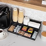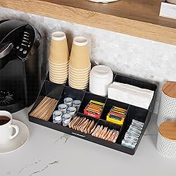- The Ultimate Snack & Condiment Organizer Set - Elevate Your Coffee Break Experience Transform your coffee breaks with this 2-piece set - a spacious 2-tiered, 11-compartment cup and condiment organizer, and a 2-tier snack carousel, designed to make finding the right choices a breeze. Say goodbye to rifled-through and unusable cups, condiments and snacks. This set neatly displays items for easy access and caters to diverse preferences. Ideal for hotel lobbies, breakrooms, hospitality suites, restaurants, and office reception areas, this organizer set is perfect for various settings. Beyond coffee cups, condiments and snacks, these organizers can be used creatively on countertops or inside cabinets to store office supplies, art materials, and more. The varying compartment sizes make it a helpful tool for organizing pens, rubber bands, paintbrushes, and other items. Constructed from durable, food-safe plastic, the organizers are ready to use straight out of the box. Rubber grips on the bottom surface ensure stability on countertops. Lightweight and durable, these compact organizers are ideal for creating a complete beverage and snack station for office breakrooms, parties, and hospitality suites. It also makes a thoughtful gift for anyone looking to enhance their coffee break experience and keep their beverage and snack area tidy and organized.